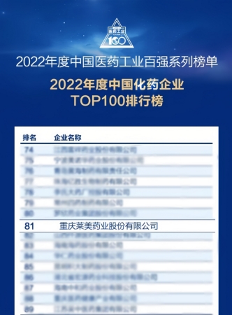 6月27日,2022年中國醫(yī)藥工業(yè)百強(qiáng)系列榜單發(fā)布,萊美藥業(yè)以良好的綜合實(shí)力、研發(fā)創(chuàng)新力及社會影響力,入選“2022年度中國化藥企業(yè)TOP100排行榜”,位列榜單第81位。