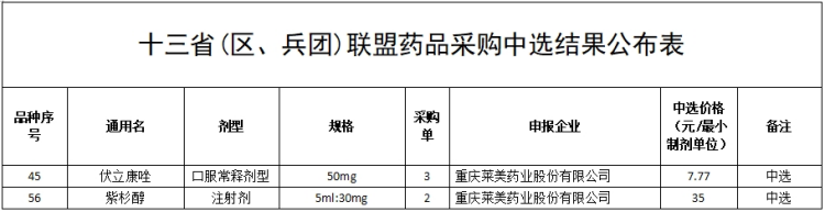 4月15日,十三省(區、兵團)聯盟采購領導小組辦公室發布公告,根據《十三省(區、兵團)聯盟藥品集中帶量采購文件》(編號:YPLH-YD2024-1)文件要求和工作安排,經企業申報、信息公開、擬中選結果公示、企業申訴和復核等程序,產生中選結果。萊美藥業的伏立康唑片和紫杉醇注射液中選十三省藥品聯盟集中采購。
