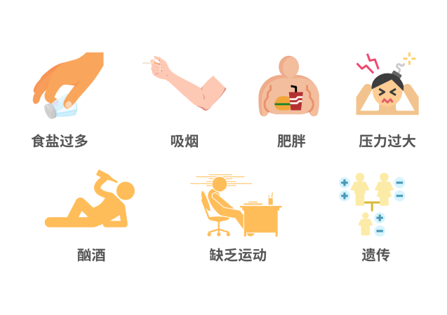 高鈉低鉀膳食、超重和肥胖、吸煙、過量飲酒、社會心理因素、高齡等是高血壓發病的常見危險因素。除此之外,空氣污染、高海拔、高血壓家族史、缺乏體力活動等也會影響高血壓的發病。