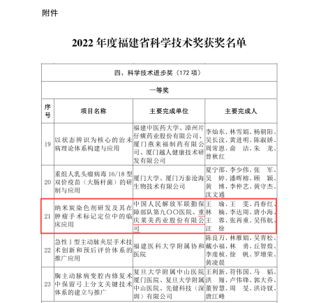 近日,福建省人民政府公布了2022年度省科學技術獎獲獎名單,重慶萊美藥業股份有限公司參與的“納米炭染色劑研發及其在腫瘤手術標記定位中的臨床應用”項目獲得福建省科學技術進步獎一等獎。此次獲獎是對公司科技創新工作的高度肯定。