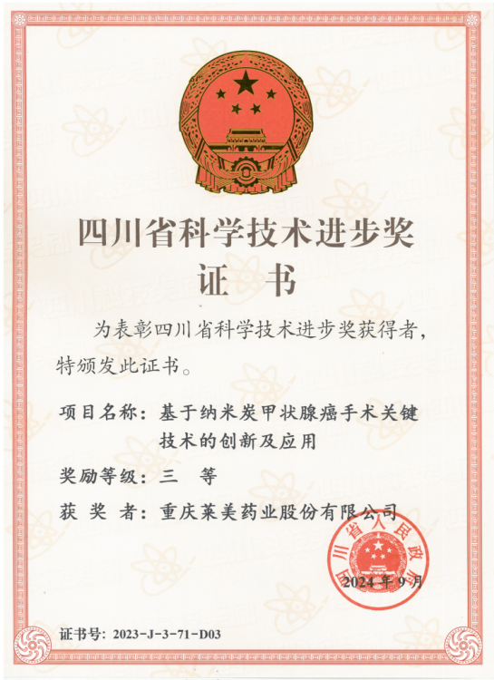 日前,四川省人民政府發(fā)布關(guān)于2023年度四川省科學(xué)技術(shù)獎勵的決定。重慶萊美藥業(yè)股份有限公司參與的“基于納米炭甲狀腺癌手術(shù)關(guān)鍵技術(shù)的創(chuàng)新及應(yīng)用”獲得四川省科學(xué)技術(shù)進步三等獎。