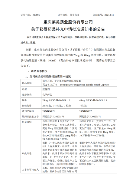 近日,重慶萊美藥業股份有限公司(以下簡稱“公司”)收到國家藥品監督管理局核準簽發的艾司奧美拉唑鎂腸溶膠囊20mg和40mg兩種規格、氨甲環酸氯化鈉注射液(規格:100ml)《藥品補充申請批準通知書》。